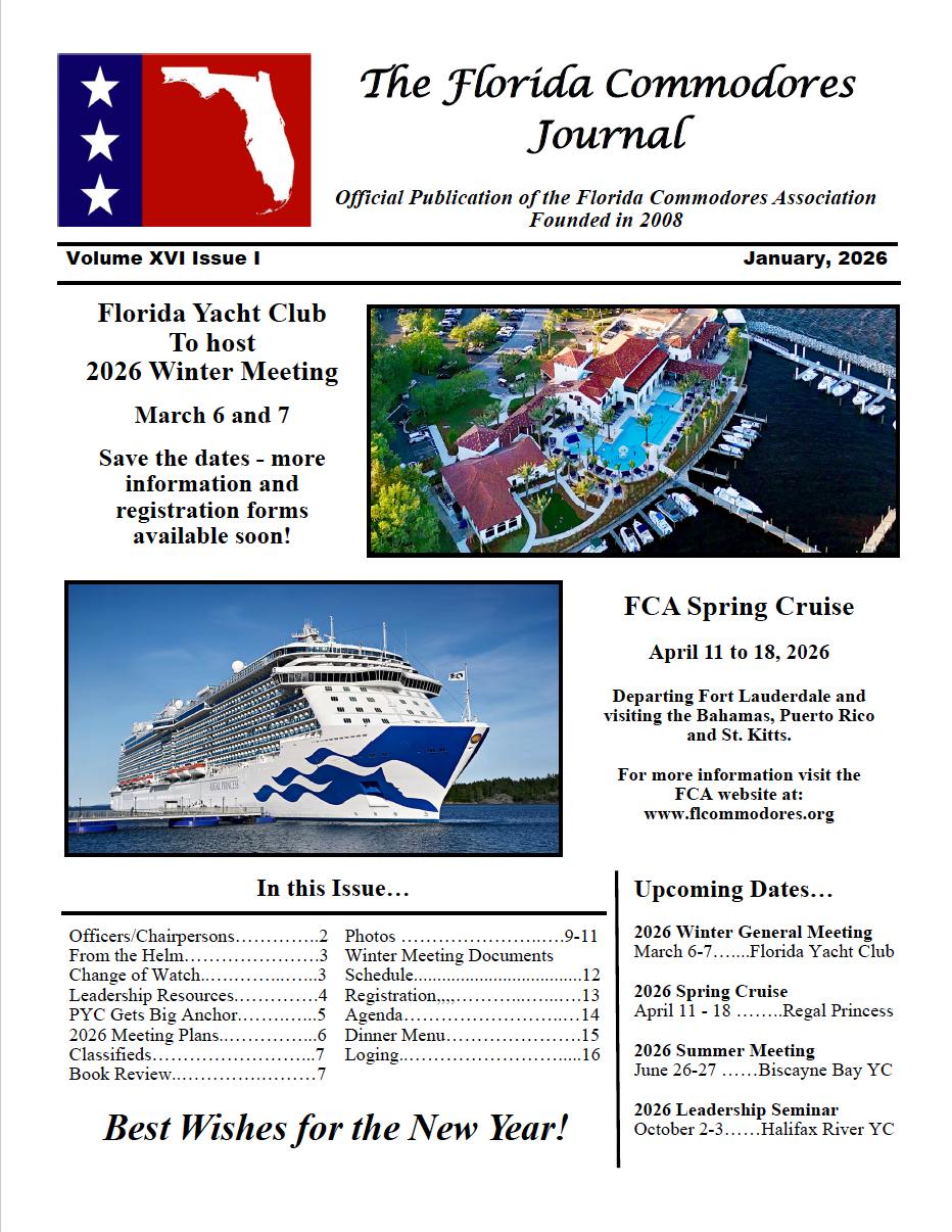 The Florida Commodores Association serves as a greatly needed link among Florida yacht clubs. It provides for the exchange of information among clubs on a statewide basis. It also provides a much needed social link and conduit for interaction among past, current and future commodores of yacht clubs in the State of Florida.
